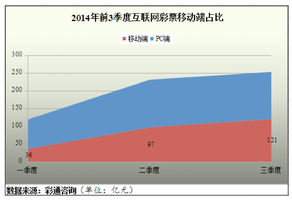 彩通咨询监测数据显示,在今年第3季度互联网彩票的253亿元销量中,移动端销售121亿元,接近互联网彩票整体市场的一半,达47.8%。第3季度,移动互联网彩票市场继续扩大,移动端单季销量首次超过100亿元,环比二季度增长24亿元,环比增幅达24.7%。而互联网彩票PC端售销量在3季度出现停滞,三季度互联网彩票环比增量完全来自于移动端的增长。