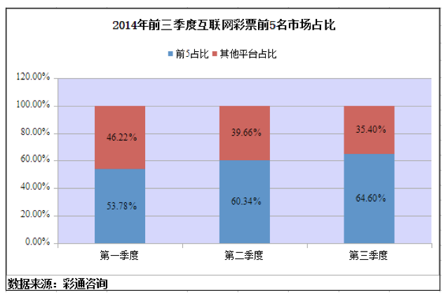 彩通咨询监测数据显示,在今年第三季度互联网彩票中,排名前5名的互联网彩票平台市场占有率进一步扩大,前5名的市场占有率达64.6%,其他众多互联网彩票平台销量市场份额仅约35%。在今年前三季度中,互联网彩票巨头优势不断扩大,前5名的互联网彩票平台市场占有率从一季度的53.78%扩大到二季度的60.34%,三季度优势继续扩大,而众多中小彩票网站虽然销量有所增长,但市场份额却不断萎缩。