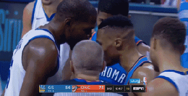 KD想持球突破,却被威少破坏了,此时威少摇摇头挑衅KD,阿杜不甘示弱,上前和威少互喷垃圾话,二人一度头碰头。