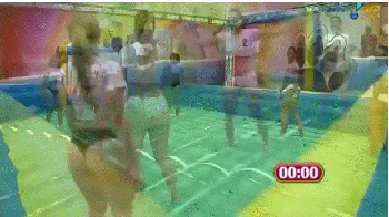 在巴西一档综艺节目里,一群身材火辣的美女们穿着比基尼在水床上踢足球。