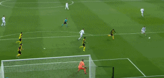 纳乔右路传中,科瓦契奇左侧倒三角回传,C罗大禁区线上领球,横带一步之后起右脚攻门,皮球划出一道弧线窜入死角,多特门将比尔基毫无反应。C罗非常兴奋,一路跑向皇马替补席,与马塞洛拥抱庆祝。欧冠联赛历史上看似轻松、却25年无人能破的纪录,被C罗的弧线击穿。