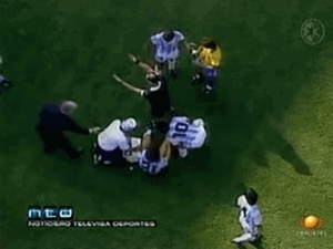 电视直播无法100%还原当时的情形,一群阿根廷人中,来了一位身穿黄衫的球员——他就是故事的主角布兰科。理疗师米格尔-迪洛伦佐将一个绿色水瓶递给巴苏亚尔多,布兰科凑过来,巴苏亚尔多将绿色水瓶递给他。布兰科洗了一把脸,水浇头上解热,将剩余的水一饮而尽……