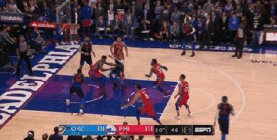 没错,说的就是今天雷霆客场挑战76人的比赛。常规时间最后几分钟,雷霆进攻哑火,76人乘机反扑,扳平比分,随着乔治投篮不进,双方进入第一个加时。