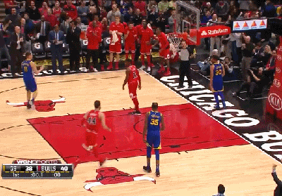 在今天勇士与公牛比赛的首节最后一攻,勇士在自家半场被抢断得分,只剩0.1秒。此时,底线发球的斯蒂芬-库里将球推向公牛球员恩瓦巴的屁股上,耗完了时间。