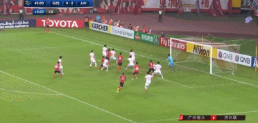 上半场补时阶段,恒大左路任意球传入禁区,高拉特争下头球,张成林跟进凌空打门,皮球再次击中横梁弹出。