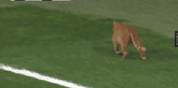 下半场开始不久,主裁判突然吹停了比赛。就当大家一脸懵X的时候,镜头给到了一只闯入球场的橘猫。