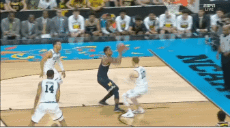 4月3日讯,NCAA决赛目前正在进行,上半场独得18分的迪文岑佐下半场继续有出色发挥,他在一次防守中用一个排球式的拦网动作将对方球员马修斯的扣篮直接封堵下来。