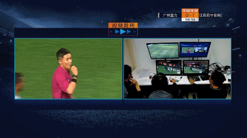 比赛来到第57分钟,苏宁本场的进球功臣黄紫昌持球突破到禁区内左侧底线附近被富力球员放倒,虽然当时他以略带夸张的动作倒地,但裁判并没有任何表示,而富力也拿回球权展开反击。当比赛继续进行了一分钟后,极具争议的一幕出现了,主裁判在收到视频助理裁判的指示后突然吹停了比赛并通过回看比赛视频判罚富力球员一分钟前在本方禁区放倒黄紫昌的动作为犯规,判给了苏宁一粒点球。