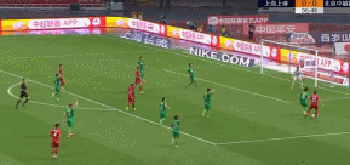 上港在禁区弧附近打出了娴熟的地面配合,艾哈迈多夫右路接球后往后一扣再传中,禁区内远端接应的陈彬彬迎球起脚,爆射没踢成却把球踢飞了!