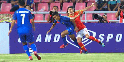 第6分钟,泰国队员在禁区内倒地,但裁判没有做出表示。