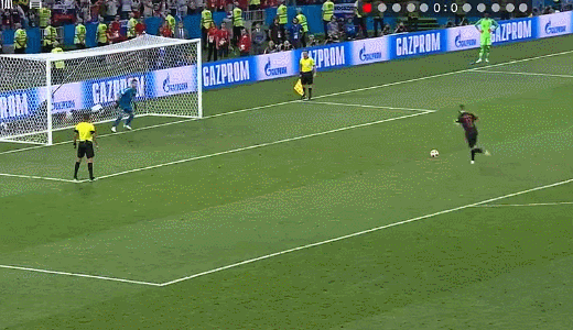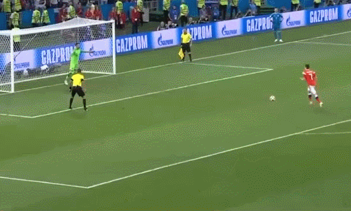 第三轮:俄罗斯主罚球员费尔南德斯,助跑打门后直接把球打出左侧立柱。