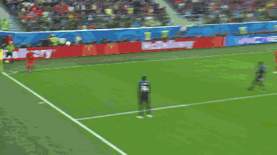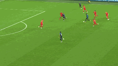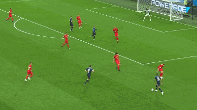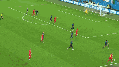 第 13 分钟,法国队发动反击,博格巴直塞,库尔图瓦出击及时,抢在姆巴佩前将球没收。