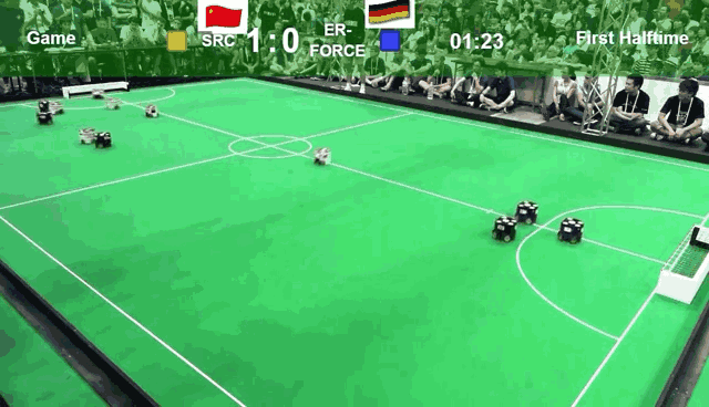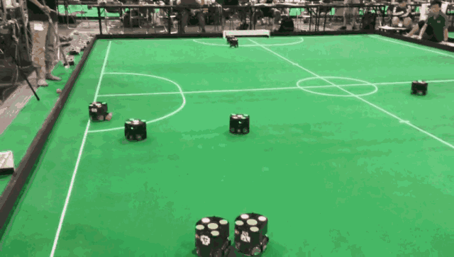 与人类的足球赛不一样的地方在于,机器人足球赛的球场没那么大,这主要是基于目前机器人的续航考虑,而且,目前参数的机器人,都是迷你型的机器人,你可以理解为小矮人。从今年开始,场地面积扩大一倍,从原来的9×6米扩展为12×9米;机器人数量从6个增长为8个,更加接近于人类比赛队伍数量。