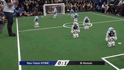 在去年的比赛中,足球机器人还做出了一个里程碑式的举动:战术犯规。被撞倒一屁股坐起来~