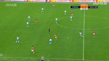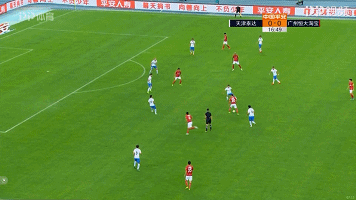 有了两球领先的保证,下半场恒大进攻端的层次性体现的更加明显。图中可以看到,三名巴西外援形成三角站位强势占据中路空间,迫使泰达需要集中极大精力在中路防守上,忽视了对于中卫身后空间的保护。而恒大三外援站位中路,要的就是泰达身后的空间。