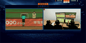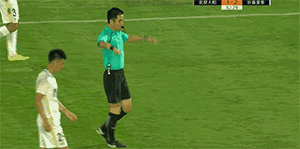 之后,我们可以看到裁判员和VAR开始沟通,裁判员跑向场边回看视频,回看视频结束之后,判罚了球点球,并向北京人和队29号队员出示红牌,将其罚令出场。