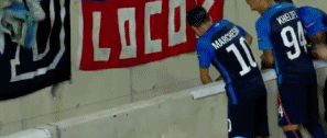 科洛礼进球后跑到客队球迷区庆祝,翻过围栏后,不料纵身跃进球迷看台前的间隙处,最后只能由队友将其从坑中捞起。