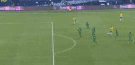 第43分钟,巴西取得领先,内马尔直塞,热苏斯禁区右侧单刀射门入网,1-0!