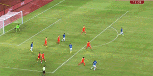 第15分钟,中国队发出战术角球,吴曦传中球送至禁区内,郜林头球攻门顶得太正,没能考验到对方门将。第17分钟,印度队获得前场左路定位球机会,塔帕将球送到后门柱附近,无人盯防的切特里凌空垫射高出球门,中国队逃过一劫!