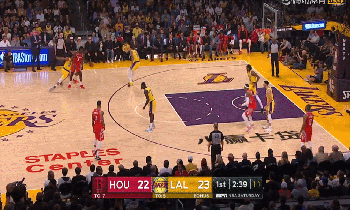 开场后火箭打出7-0的开局,但湖人在詹姆斯的带领下追平比分,此后两队连续打成平手,安东尼压哨中投命中帮助火箭略微领先。半场调整过后仍旧是火箭率先发力连中三分,保罗连得五分帮助火箭在三节结束时守住1分领先优势。