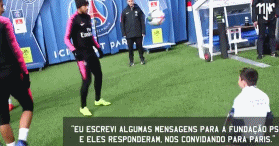 内马尔和卡瓦尼留在场内与失去双足的孩子踢球。虽然这位小球迷只能依靠上半身移动,但是他总能用头部准确地顶回内马尔卡瓦尼的传球。