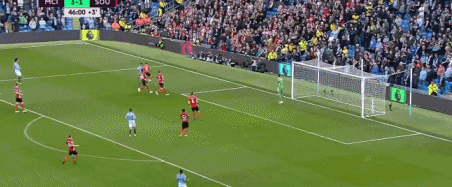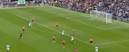 第12分钟,伯纳多-席尔瓦在右边路传给斯特林,后者拿球后面对多名后卫突入到小禁区附近横传门前,帮助阿圭罗门前抢点破门完成个人英超150球里程碑,而且将比分扩大为2-0。