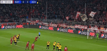 第71分钟,基米希左侧角球传中,雅典AEK后卫禁区内头球一蹭,莱万多夫斯基后点凌空垫射命中右上角,拜仁慕尼黑2比0扩大了领先优势。