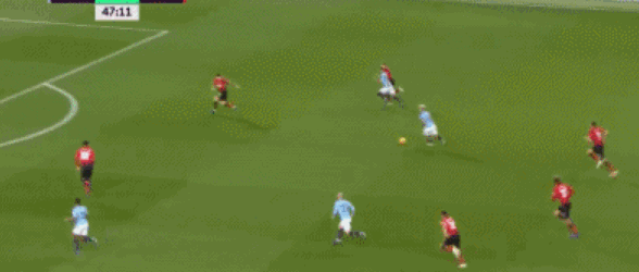 开场后,曼城便取得了进球,斯特林左边路传中,后点的伯纳多-席尔瓦跟上将球扫向门前,大卫-席尔瓦冷静扣过曼联防守球员后,右脚射门攻破了德赫亚把守的球门。这个进球阿圭罗也有一定的功劳在里面,正是他积极地前插带走了两名曼联中卫,所以大卫-席尔瓦才被遗漏并获得了得分机会。