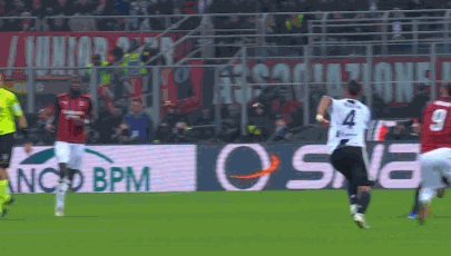 第34分钟,贝纳蒂亚放倒巴卡约科吃到黄牌。第38分钟,伊瓜因在禁区内将球一挑,皮球打在贝纳蒂亚手上,主裁判经过VAR后判给米兰一个点球。伊瓜因站在点球点前,大力轰门,什琴斯尼反应神速倒地将球碰了一下,皮球击中立柱后弹出,米兰错失进球良机!
