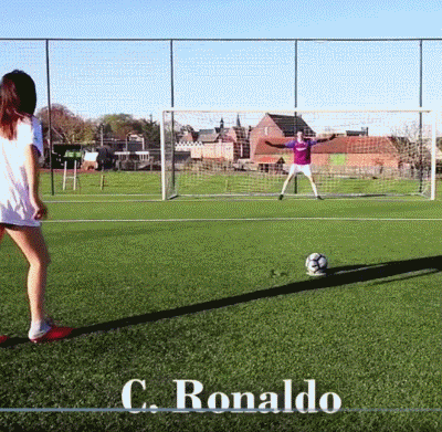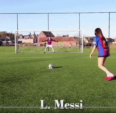 接着她换上了梅西的球衣,用梅西标志性的姿势来踢点球并踢出了一个死角,进球后露出了可爱的笑容,和梅西本人的庆祝方式也有点像。可以看出这位妹子的脚法相当不错。
