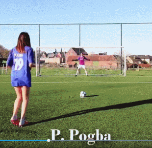 球星射点球的姿势一直都是被模仿的动作之一,这名外国的妹子在模仿C罗、博格巴等球员射点球可谓有模有样。这位长腿妹子穿上尤文球衣模仿C罗的姿势射入点球,随后进行总裁式的霸气庆祝。
