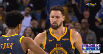 国王也有机会终结比赛,但是希尔德上篮不进,队友补篮把球卡在了篮脖子上。双方中线跳球,KD把球拍向后场想耗尽时间,灯亮钟响,勇士老板激动地发出呐喊声!