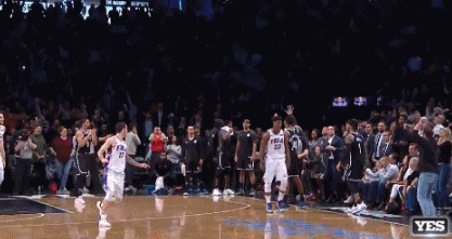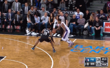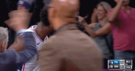 这球进了之后,恩比德都激动地往JB身上骑了!