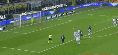 第76分钟,福法纳禁区内防守传中时手球,裁判通过VAR回放后判定了点球,伊卡尔迪当仁不让出现在了点球点位置,只见他利用加速动作骗过了乌迪内斯门将穆索,并用右脚脚尖轻巧的将皮球挑起,皮球在空中画出美妙弧线后飞进球网,伊卡尔迪打进了一粒精彩的勺子点球!