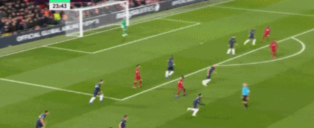 第24分钟,利物浦取得领先,法比尼奥挑传,马内前场胸部停球后单刀面对德赫亚射门入网,1-0!