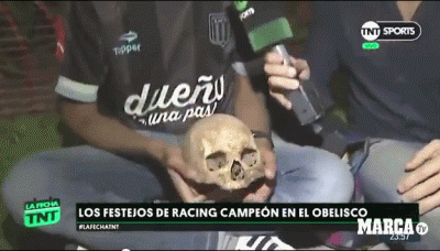 上周末,阿根廷竞技队1-1与蒂格雷战平后,提前一轮问鼎本赛季阿超联赛冠军。在竞技队夺冠后,TNT记者在体育场外采访欢庆的球迷。此时一名老年球迷,引发了这名记者的关注。这名球迷坐在路边,手中抱着一个骷髅头骨。