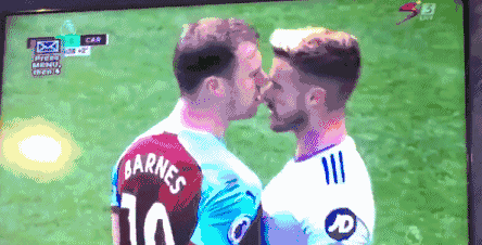 昨天进行的一场英超联赛中,伯恩利迎战卡迪夫城,伯恩利球员巴恩斯突然往卡迪夫球员本内特的鼻子送上深情一吻,结果被黄牌警告。