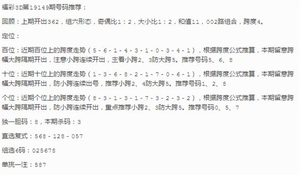 2019年福彩3D第149期 艾米丽跨度分析看好胆码8