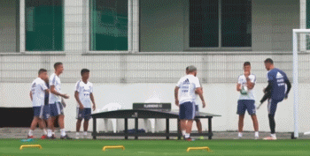 在昨天的训练中,阿根廷还玩了乒乓足球。两人一组出现在乒乓球台两侧,规则与乒乓球类似。在试图用脚将球踢到对方球台时,阿圭罗把球踢到了球网上。在头球时,阿圭罗又把球顶出了球台范围。