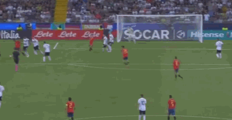 开场仅7分钟西班牙就率先破门。法比安-鲁伊斯中线接奥亚尔萨瓦尔直塞,带球往前突进,甩开身后的德国后卫,带球到禁区弧顶急停后突然一脚抽射,打出了一记弧线球破门,西班牙1-0。第18分钟,德国队左路瓦尔德施密特角球传中,前点西班牙后卫顶出禁区,禁区外亨里希斯凌空抽射踢飞。