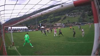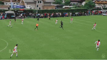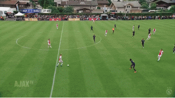 这个进攻,始于右中卫在中场右侧的直传。几名队友进行中距离一脚出球式传球,右后卫掌控节奏后又将球横传到了禁区前。阿贾克斯三名球员随后在禁区右肋部踢出精彩的团队配合,一个横传和一个穿裆直传,直接打穿了对方防线。