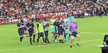 在尤文图斯与热刺的国际冠军杯比赛结束后,一位球迷突然冲进场内,教练为了保护球员立即上前拦住这位球迷。有点搞笑的是教练与球迷的“互动”看起来有点像老鹰抓小鸡。