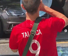 黄博文发的前2个动图中,喝水人身穿着印有塔利斯卡名字的恒大9号战袍。第3张图是一张合影,主人公是黄博文和一个长相酷似塔利斯卡的大叔。