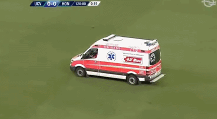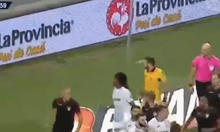 卡拉奥华大学(罗马尼亚)vs布达佩斯捍卫者(匈牙利)的比赛中,双方球员在一次角球进攻后发生冲突。随后卡拉奥华大学球员(白色球衣)推倒布达佩斯捍卫者球员(黑色球衣),进一步加剧了冲突。来自北爱尔兰的裁判阿诺德-亨特被一枚看台上投掷而下的烟花砸伤受伤跪倒在地,救护车场内为其治疗。