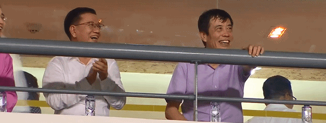 新任足协主席陈戌源看台观战,在中国队打进第二球后,陈戌源露出灿烂笑容。