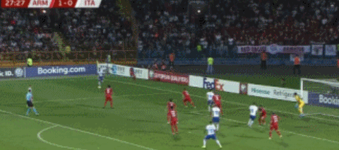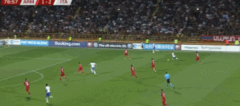 本场比赛意大利的控球率高达68%,全场射门17次,其中7次射正打进3球,而亚美尼亚全队只有3次射正。不过比赛第11分钟却是卡拉佩特扬为亚美尼亚率先进球,第28分钟,贝洛蒂接到埃莫森左路传中后在禁区后点无人防守的情况下近距离垫射破门,帮助意大利1-1扳平。上半场最后时刻卡拉佩特扬两黄变一红被罚下,意大利多一人应战。