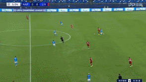 以442出战的那不勒斯,在组织进攻时呈现出双前锋拉边的态势,目的就是等待中后场队友通过传跑破开利物浦高位逼抢之后能有效的分边。从上图我们可以看到,那不勒斯的传控十分到位,而洛萨诺得球之后在边路加速传中,就是球队上半场比赛战术的直接体现。
