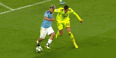 随后,曼城继续大举压上加强进攻,阿圭罗一次禁区内带球突破时被防守球员绊倒在地,蓝月军团众将见势纷纷上前索要点球。慢镜头显示,防守球员确实没有踢到皮球,而是直接踢到了阿圭罗的脚踝。客观来说,曼城理应得到一个点球。但意外的是,当值主裁听取VAR后没有判罚点球。此举让场边的瓜迪奥拉大为不满,加泰罗尼亚人不停碎碎念抱怨着什么,直到被主裁出示黄牌警告,他才频频摇头不语。