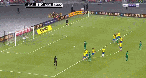 第45分钟,迪希奥主罚点球破门。补时第2分钟,库蒂尼奥传球,内马尔禁区内单刀射门被扑出。上半场结束,巴西暂时1-1平塞内加尔。