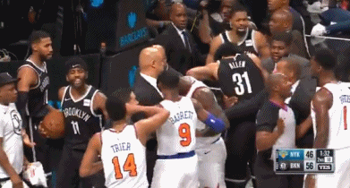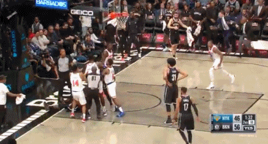 今日,篮网主场迎战尼克斯,在上半场快结束时,双方球员在场上争夺球权时发生了冲突。